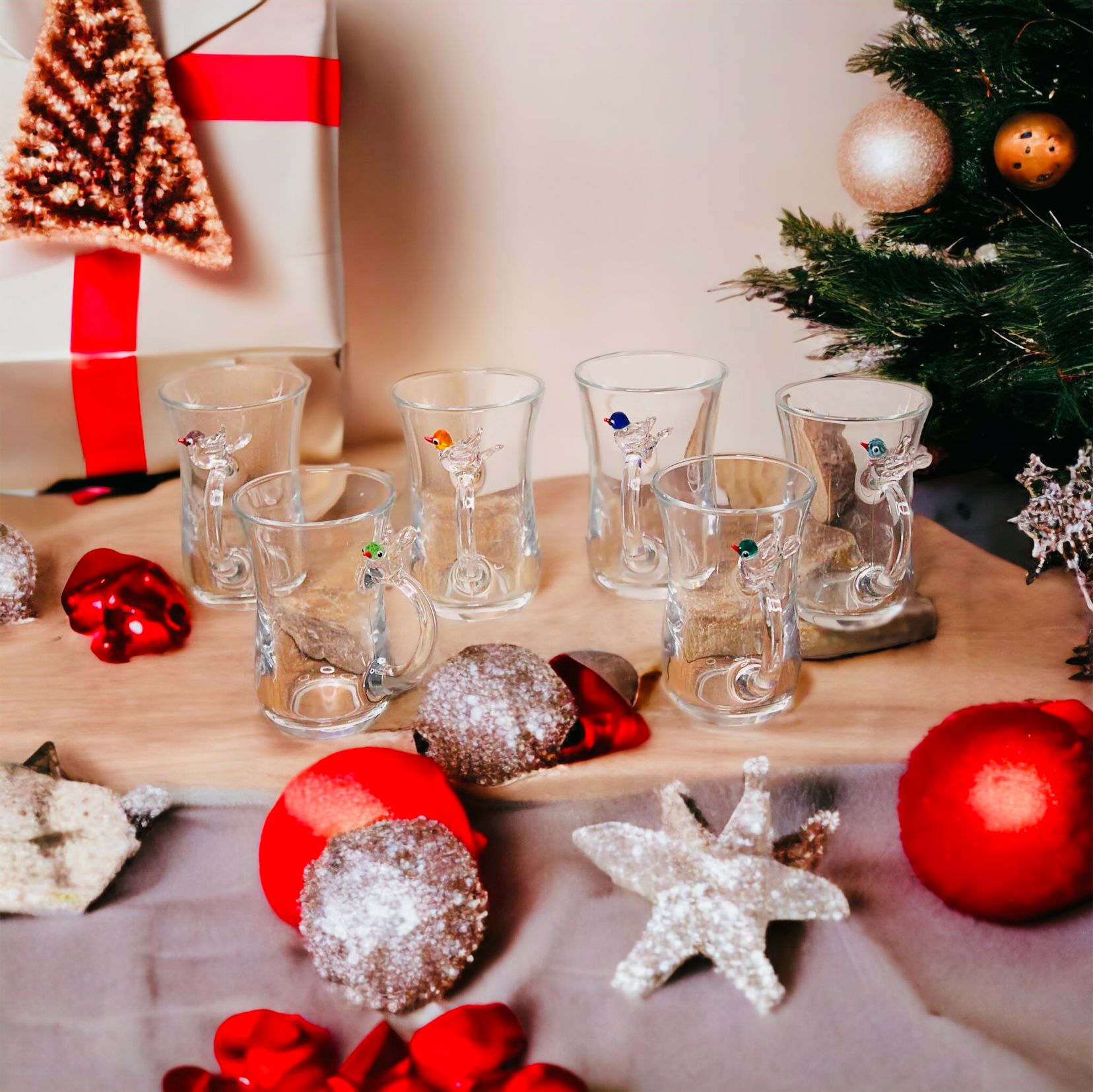 Kuş figürleri alevde cam şekillendirme tekniğiyle tamamen el yapımı olarak üretilmiştir. Görseldeki gibi 6 adet çay bardağı 6 ayrı renk kuş figürü ile gönderilmektedir.